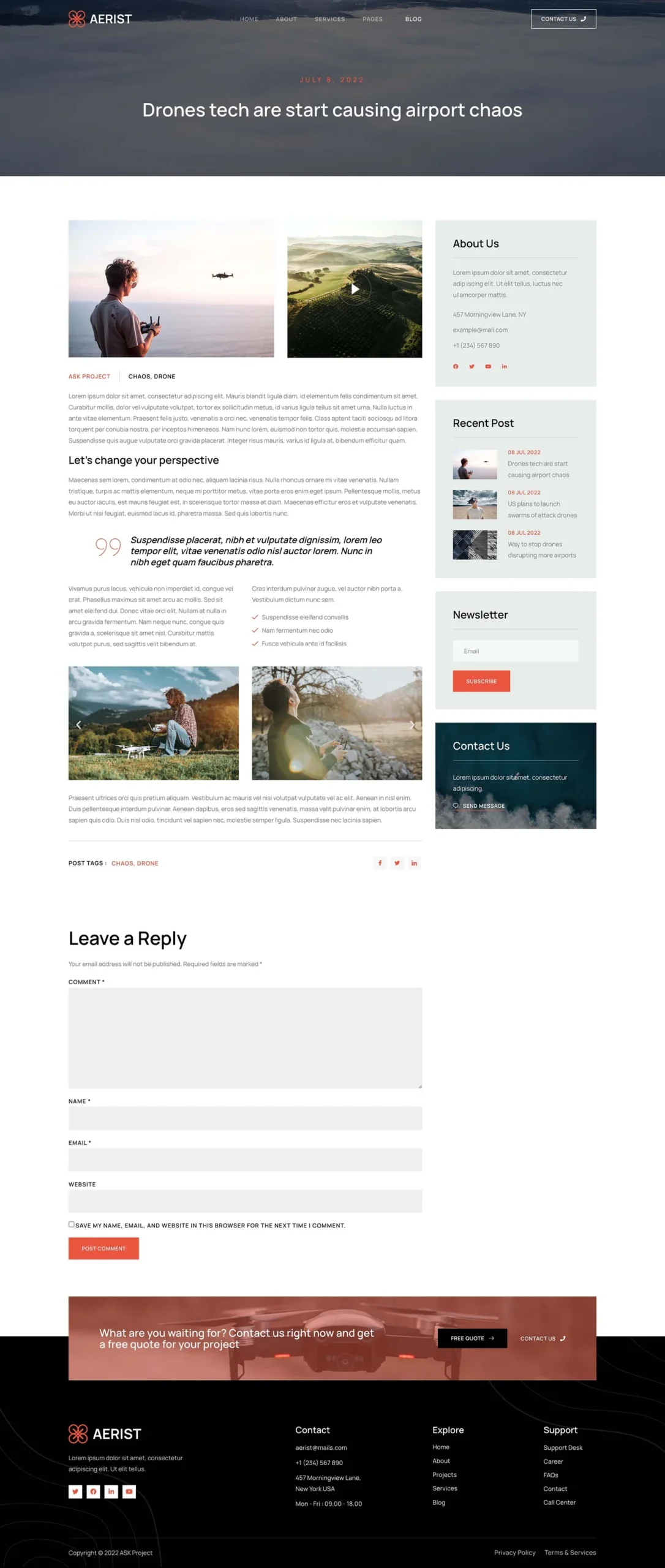 Aerist is a sleek and modern Elementor Template Kit designed specifically for drone rental services, aerial photography, and videography businesses. This template features a clean, fully responsive design that is easy to customize, requiring no coding skills. With 12 pre-designed pages and 14 stunning templates, Aerist allows you to create a professional website in just a few clicks.