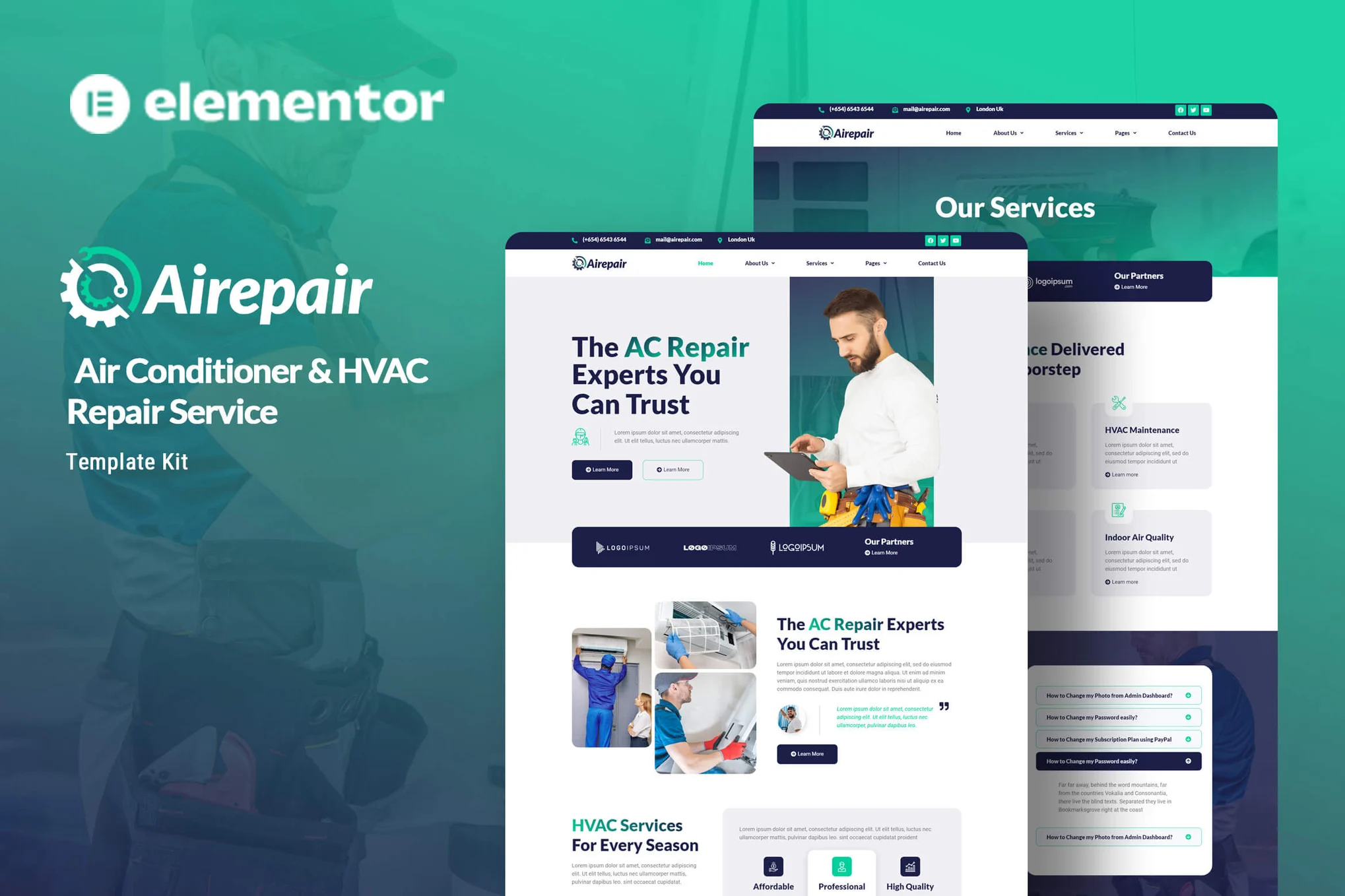 Airepair is a modern and professional Elementor Template Kit designed for HVAC Repair & Maintenance Services, Air Conditioner Repair, Handyman Services, and other Air Conditioning businesses. Built with a clean, user-friendly design, Airepair ensures a smooth experience for visitors while helping businesses showcase their services effectively.